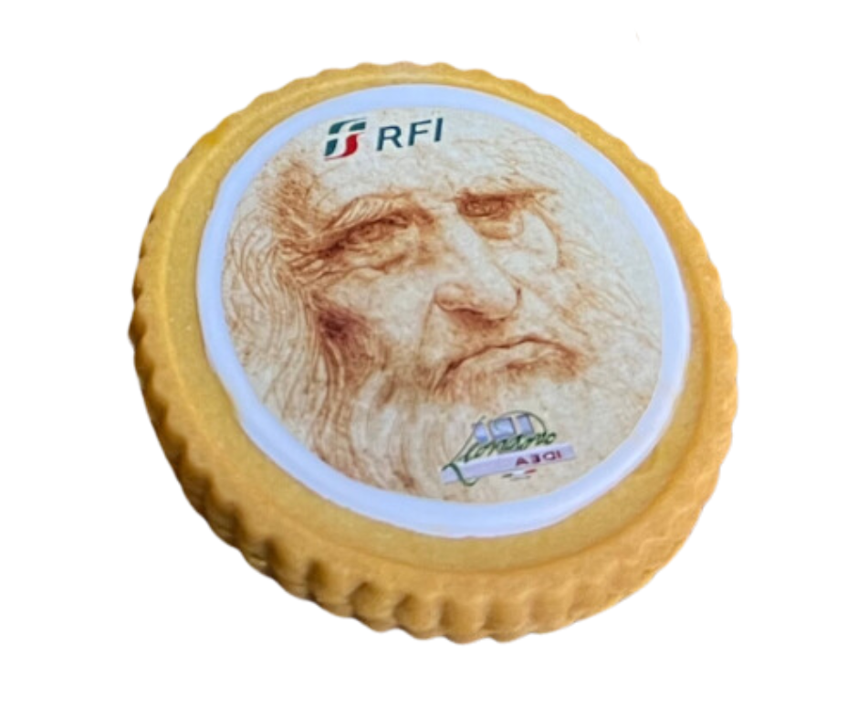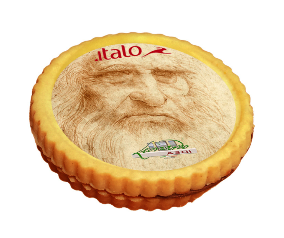 Biscotto di pasta frolla, ricoperto con cioccolato fondente e decorato con una cialda in cioccolato bianco raffigurante opere pittoriche di Leonardo da Vinci.