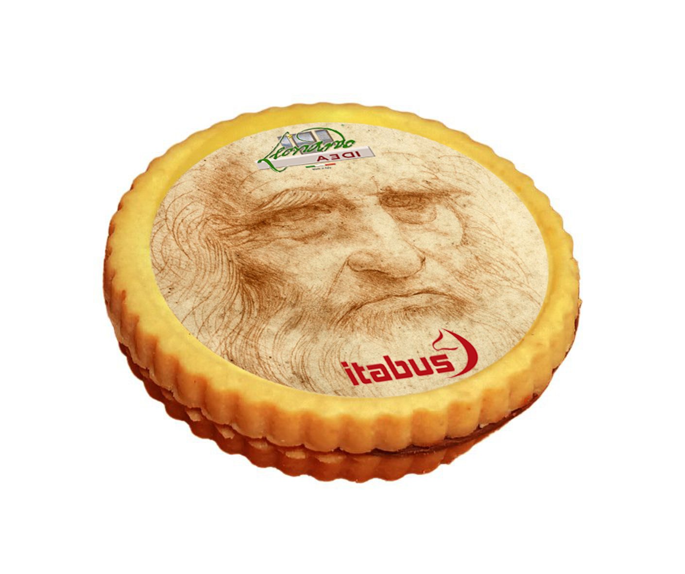 Biscotti di pasta frolla, farciti con una crema al gusto gianduia e decorati con una cialda in pasta di zucchero raffigurante opere pittoriche di Leonardo da Vinci.